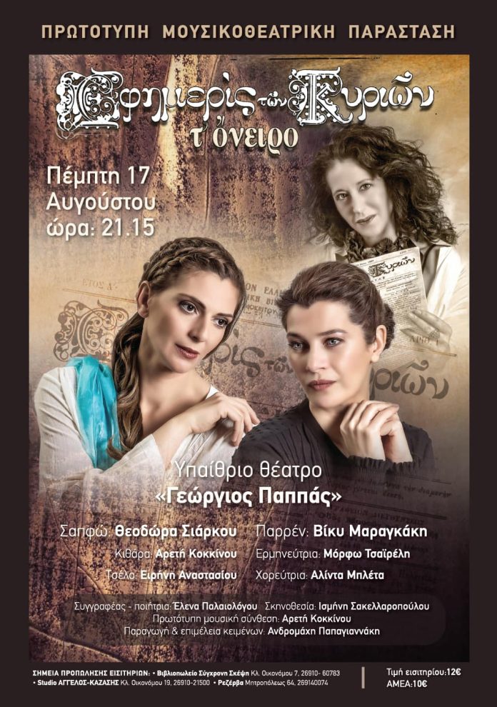 Η πρωτότυπη μουσικοθεατρική παράσταση «Εφημερίς των Κυριών τ’ όνειρο», της Έλενας Παλαιολόγου,παρουσιάζεται στο Αίγιο την Πέμπτη 17 Αυγούστου στις 9.15μ.μ. στο υπαίθριο θέατρο «Γιώργος Παππάς». Μια ιδιαίτερη παράσταση, αφιερωμένη στην αρχαία ποιήτρια και φιλόσοφο Σαπφώ, καθώς και στην πρώτη Ελληνίδα φεμινίστρια και εκδότρια εφημερίδας, την Καλλιρρόη Σιγανού-Παρρέν.