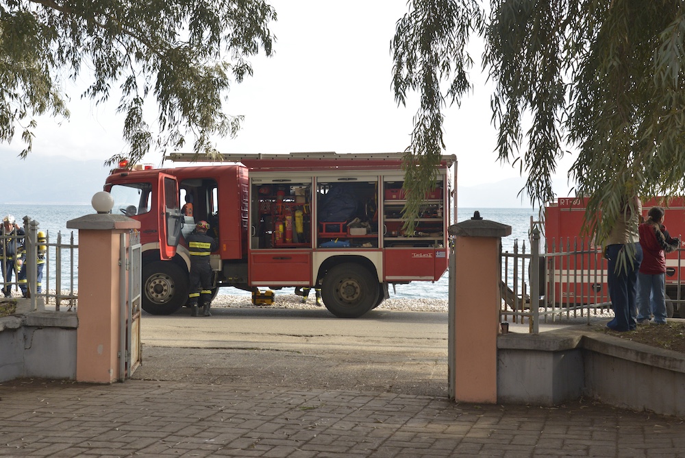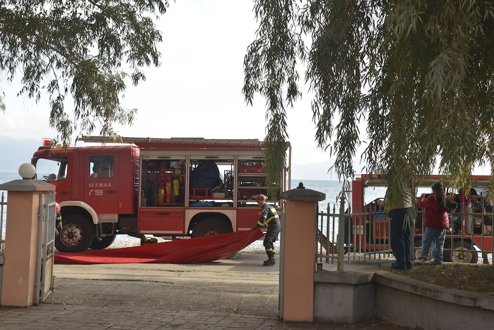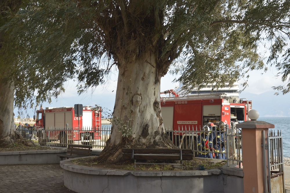 Στο πρώτο επεισόδιο, σεισμική δόνηση προκάλεσε ζημιές σε κτίριο όπου συνεργείο του Δήμου πραγματοποιούσε εργασίες συντήρησης. Στο εσωτερικό του κτιρίου υπήρχαν εγκλωβισμένοι εργαζόμενοι, ενώ στο ισόγειο εκδηλώθηκε πυρκαγιά στον χώρο των ηλεκτρικών πινάκων. Οι πυροσβεστικές δυνάμεις ανέπτυξαν εγκαταστάσεις κατάσβεσης και πραγματοποίησαν επιχείρηση απεγκλωβισμού ατόμου που είχε παγιδευτεί στο κλιμακοστάσιο του δεύτερου ορόφου, χρησιμοποιώντας θερμική κάμερα λόγω της έντονης παρουσίας καπνού. Το θύμα μεταφέρθηκε σε ασφαλές σημείο και στη συνέχεια παραλήφθηκε από πλήρωμα του ΕΚΑΒ για διακομιδή στο Γενικό Νοσοκομείο Αιγίου.