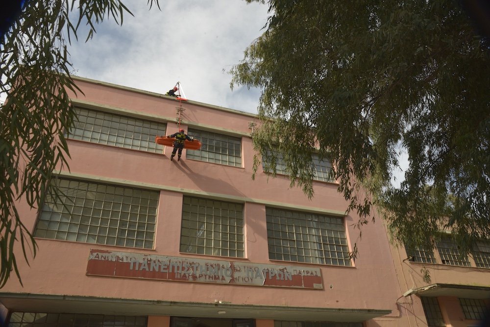Το τρίτο επεισόδιο αφορούσε εγκλωβισμό ατόμου στον δεύτερο όροφο του κτιρίου, όπου το εσωτερικό κλιμακοστάσιο είχε υποστεί σοβαρές ζημιές και δεν ήταν πλέον ασφαλές. Το άτομο, σε κατάσταση πανικού, κατέφυγε στην ταράτσα του κτιρίου ζητώντας βοήθεια. Ομάδα ορειβατικής διάσωσης της 6ης ΕΜΑΚ προσέγγισε το σημείο από την πίσω πλευρά του κτιρίου και με τη χρήση ειδικού ορειβατικού εξοπλισμού πραγματοποίησε τεχνική οριζόντιας μεταφοράς με φορείο από μη προσβάσιμο σημείο, ολοκληρώνοντας με επιτυχία τον απεγκλωβισμό.