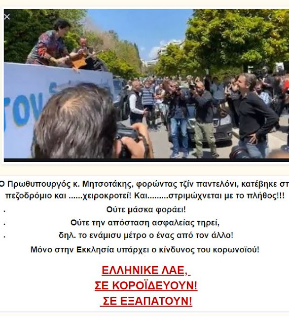 ____Μη απατάσθε: Τα μέτρα, οι μάσκες, οι αποστάσεις και οι απαγορεύσεις, γενικώτερα οι σχετικές οδηγίες του κ. Χαρδαλιά, της κας Κεραμέως και των λοιπών Κυβερνητικών Στελεχών ΔΕΝ ΜΑΣ ΣΩΖΟΥΝ! Μόνον Ο Χριστός είναι ο Σωτήρας μας, η ελπίδα μας, η καταφυγή μας και η ελπίδα μας! Άλλωστε, ας μη λησμονούμε, ότι οι Κυβερνητικοί παράγοντες, οι οποίοι μας επιβάλλουν τα σκληρά αυτά μέτρα συμπεριφοράς κατόπιν εντολής των σκοτεινών Δυνάμεων της Παγκοσμιοποιήσεως, ΑΥΤΟΙ ΟΙ ΙΔΙΟΙ ΔΕΝ ΤΑ ΤΗΡΟΥΝ! Καμαρώστε τον κ. Χαρδαλιά: