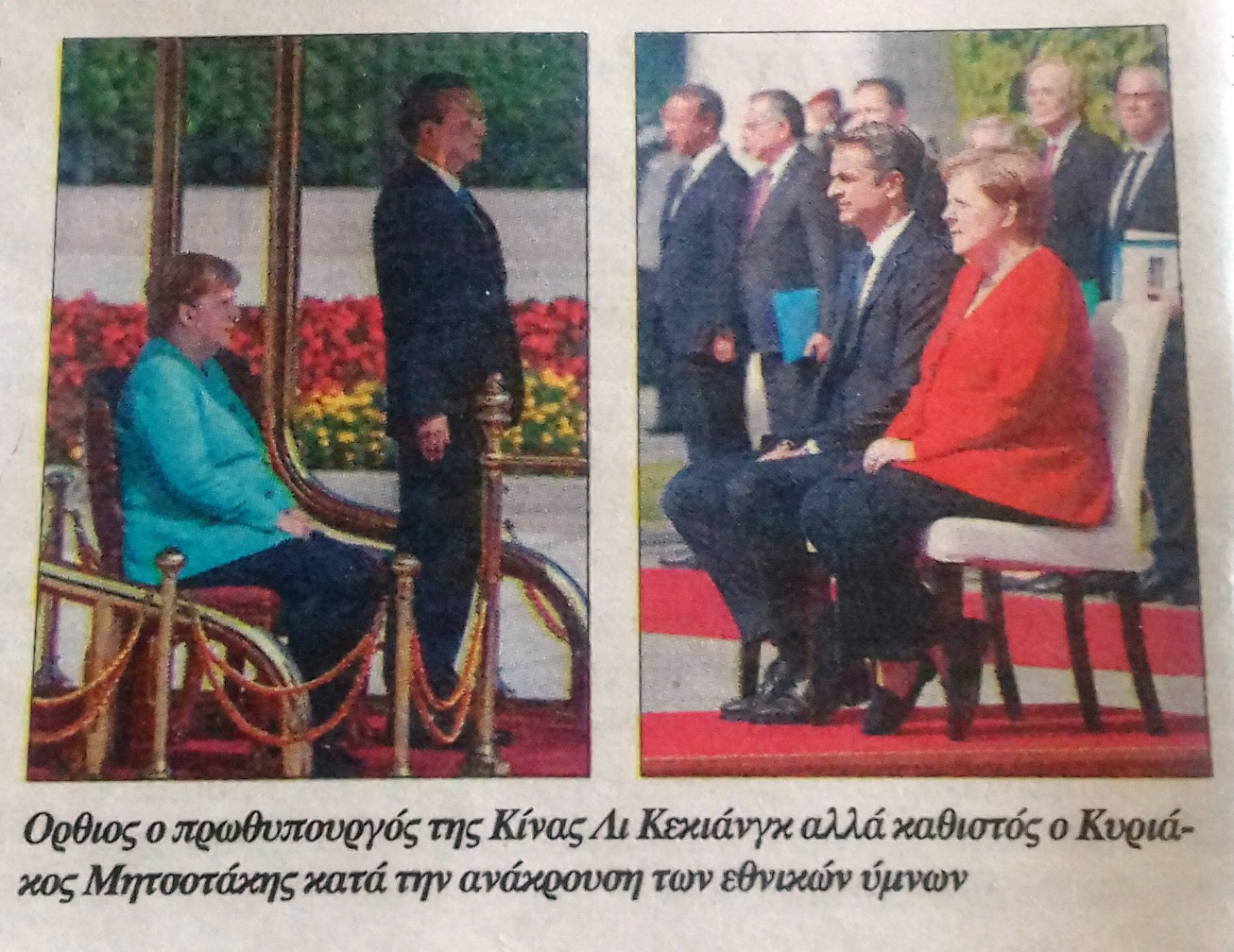 3. Ο Πρωθυπουργός της Ελλάδος, περιφρονεί την ένδοξη Πατρίδα μας, καθ’ όσον, ευρεθείς στη Γερμανία, ΔΕΝ ΣΗΚΩΘΗΚΕ ΟΡΘΙΟΣ, όταν η Μουσική επαιάνιζε τόν Εθνικό μας Ύμνο! Κάθονται και η ασθενής κα Μέρκελ καί ο υγιέστατος κ. Κυριάκος Μητσοτάκης! Αντιθέτως ο Πρωθυπουργός της Κίνας ΔΕΝ ΚΑΘΕΤΑΙ, αλλά ίσταται όρθιος!