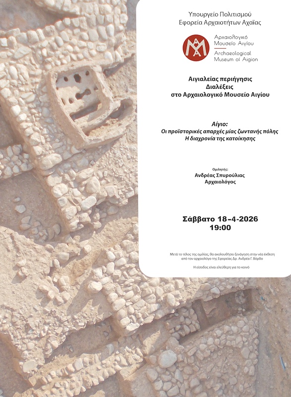 Η συγκεκριμένη ομιλία θα πραγματοποιηθεί το Σάββατο 18 Απριλίου 2026 και ώρα 7.00 μ.μ. με θέμα: «Αίγιο: Οι προϊστορικές απαρχές μίας ζωντανής πόλης. Η διαχρονία της κατοίκησης». Ομιλητής είναι ο κ. Ανδρέας Σπυρούλιας,Αρχαιολόγος, υποψήφιος Διδάκτωρ του Πανεπιστημίου Ιωαννίνων.