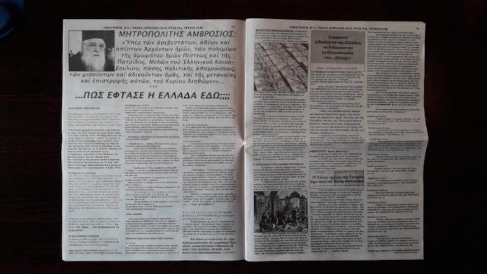 Προσφάτως δε η μηνιαία εφημερίδα «Ομογένεια», που εκδίδει στη Νέα Υόρκη ο δημοσιογράφος κ. Νικόλαος Νοταρίδης, αναφέρθηκε στον σεπτό Ποιμενάρχη μας, αφιερώνοντας τρεις σελίδες, μέσα στις οποίες προβάλλει το έργο του, «στο πλαίσιο της τεράστιας προσπάθειας που κάνει για να σώσει οτιδήποτε μπορεί να σωθεί από τους σημερινούς κυβερνώντες οι οποίοι μαστίζουν ανηλεώς την παραδοσιακή Ελλάδα», όπως τονίζει χαρακτηριστικά στο προλογικό του σημείωμα ο εκδότης.