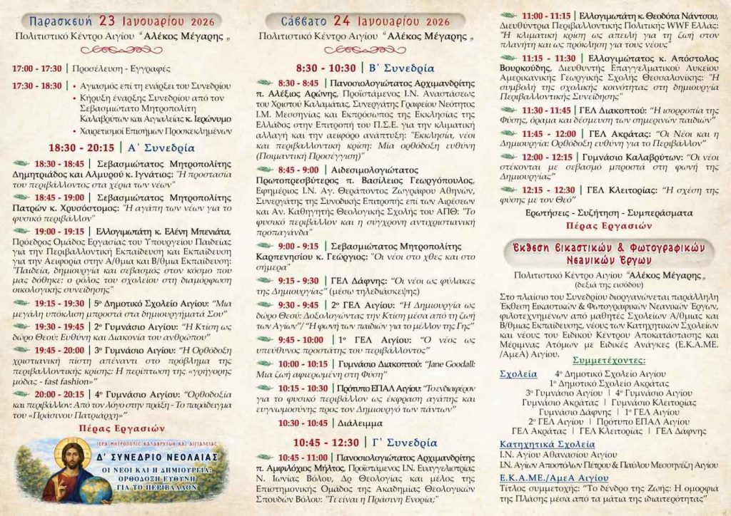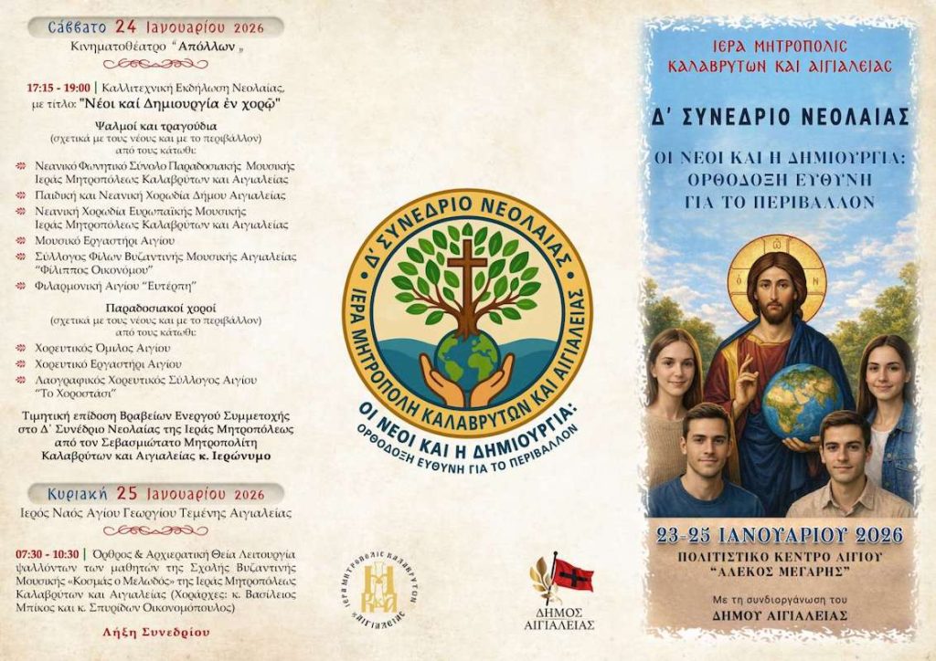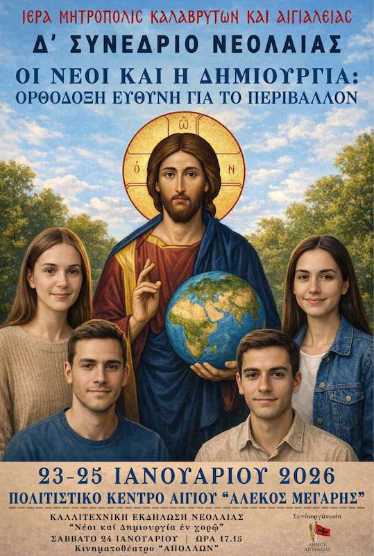 Η Ιερά Μητρόπολη Καλαβρύτων και Αιγιαλείας, στο πλαίσιο της αδιάλειπτης μέριμνάς Της υπέρ της νεολαίας και της σχέσεως Αυτής με τις αξίες της Ορθόδοξης παράδοσης, διοργανώνει το Δ΄ Συνέδριο Νεολαίας, με θέμα: «Οι Νέοι και η Δημιουργία: Ορθόδοξη Ευθύνη για το Περιβάλλον», το οποίο τελεί υπό την αιγίδα του Σεβασμιωτάτου Μητροπολίτου Καλαβρύτων και Αιγιαλείας κ. Ιερωνύμου και συνδιοργανώνεται με τον Δήμο Αιγιαλείας, με τη συνδρομή της Περιφέρειας Δυτικής Ελλάδος.