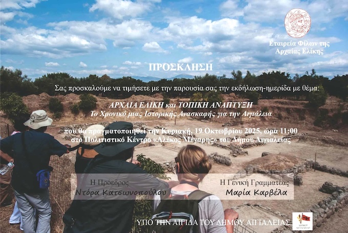 Στο πλαίσιο των εκδηλώσεων της Εταιρείας Φίλων Αρχαίας Ελίκης για το έτος 2025, που ξεκίνησε τον Ιανουάριο 2025 με την παρουσίαση του νέου, 6ου κατά σειράν, τόμου Πρακτικών του ΣΤ’ Διεθνούς Συνεδρίου για την Αρχαία Ελίκη, και συνεχίστηκε με την προβολή των πρόσφατων ντοκυμαντέρ του αμερικανικού τηλεοπτικού καναλιού DiscoveryChannel και του βρετανικού Channel 5 για την ανακάλυψη της Αρχαίας Ελίκης, στο Αίγιο και στο Πανεπιστήμιο Πατρών, πραγματοποιείται την Κυριακή, 19 Οκτωβρίου 2025, ειδική εκδήλωση-ημερίδα στο Αίγιο για την Αρχαία Ελίκη και την Τοπική Ανάπτυξη.