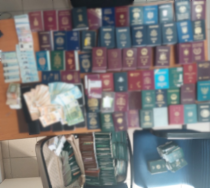 Κατασχέθηκαν περισσότερα από 1.100 διαβατήρια και άδειες παραμονής, 15.270 ευρώ και οκτώ σημειωματάρια με στοιχεία ατόμων και χρηματικά ποσά