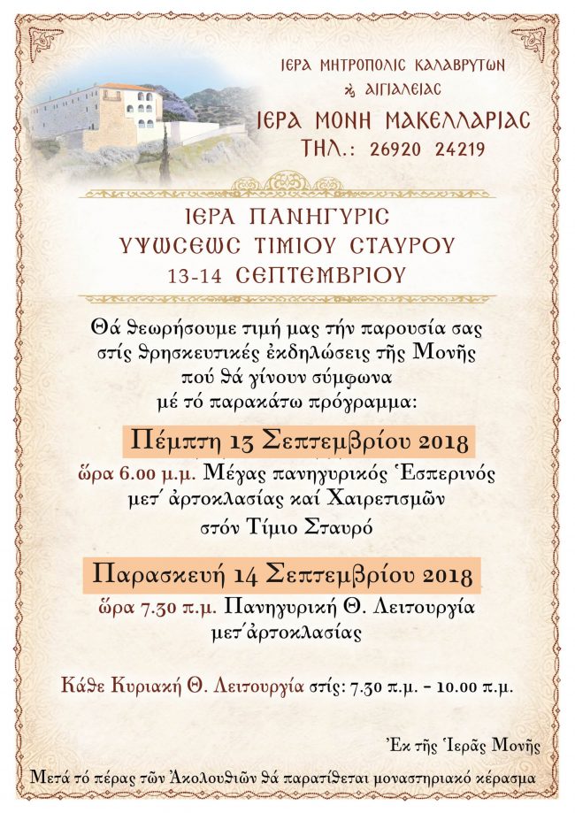 Εκκλησιαστικά Ιερά Πανήγυρις Υψώσεως του Τιμίου Σταυρού στην Ιερά Μονή Μακελλαριάς Από Φρόσω Στιβαχτοπούλου - Σταυρίδη - 6 Σεπτεμβρίου 2018 Facebook Twitter Google+ Pinterest WhatsApp Linkedin Email Viber Από την Ιερά Μονή Μακελλαριάς, εκδόθηκε το παρακάτω πρόγραμμα της Ιεράς Πανήγυρις Υψώσεως του Τιμίου Σταυρού ως εξής: