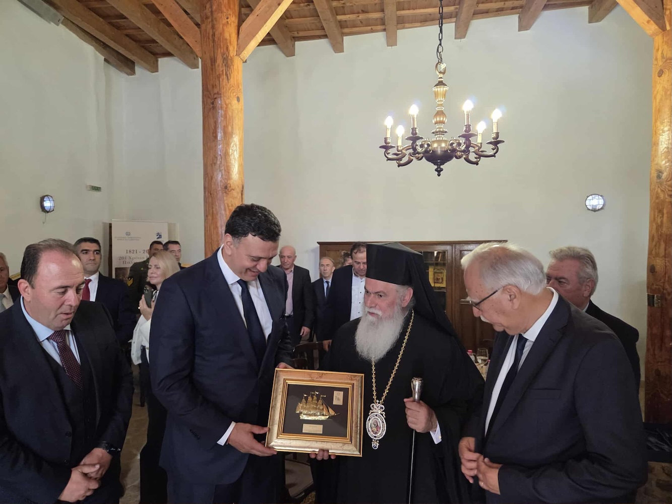 Ο Σεβασμιώτατος Μητροπολίτης κ. Ιερώνυμος, μετά το πέρας της Δοξολογίας, αφού καλωσόρισε με θερμά λόγια τον Υπουργό Ναυτιλίας και Νησιωτικής Πολιτικής κ. Βασίλειο Κικίλια στα μαρτυρικά Καλάβρυτα, απηύθυνε επίκαιρο και εμπνευσμένο λόγο, με αναφορά στα μηνύματα της ιστορικής Επετείου, τονίζοντας τη σημασία της ενότητος, της πίστεως και της φιλοπατρίας στη σύγχρονη Ελλάδα. Επίσης, ο Σεβασμιώτατος συνεχάρη τους νέους και τα παιδιά μας για τη συμμετοχή τους στις εορταστικές εκδηλώσεις, κάνοντας ειδική αναφορά στο παράδειγμα των μαθητών που παρέλασαν υπό βροχή στη Θεσσαλονίκη, αποδεικνύοντας έμπρακτα την αγάπη τους για την Πατρίδα.
