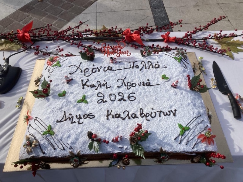Σε ιδιαίτερα χαρμόσυνο κλίμα, τελέσθηκε από τον Σεβασμιώτατο Μητροπολίτη Καλαβρύτων και Αιγιαλείας κ. Ιερώνυμο η κοπή της πρωτοχρονιάτικης πίτας του Δήμου Καλαβρύτων, την Παρασκευή 2 Ιανουαρίου 2026, στην κεντρική πλατεία της ιστορικής πόλεως, παρουσία του Δημάρχου Καλαβρύτων, Αξιότιμου κ. Αθανασίου Παπαδόπουλου, μελών της Τοπικής Αυτοδιοίκησης, εκπροσώπων της Πολιτείας, κληρικών της Ιεράς Μητροπόλεως, της Φιλαρμονικής του Δήμου, η οποία ανέδειξε έτι περισσότερο τον εορταστικό χαρακτήρα των ημερών, αλλά και πλήθους κατοίκων και επισκεπτών της περιοχής.