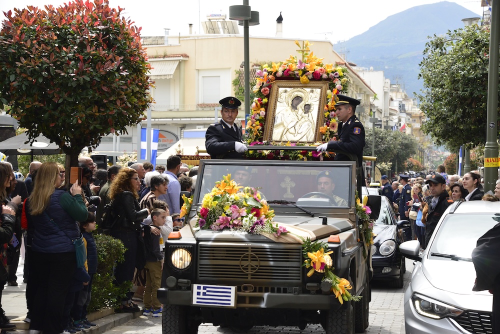 Στη συνέχεια, κατά την καθιερωμένη τάξη, η Ιερά Εικόνα της Παναγίας Τρυπητής μεταφέρθηκε με στρατιωτικό όχημα, απολαμβάνοντας όλες τις προβλεπόμενες τιμές που αρμόζουν στη Μεγαλόχαρη. Η λιτανευτική πομπή συνέχισε τη διαδρομή της προς το Ιερό Προσκύνημα, διέρχοντας από κεντρικούς οδικούς άξονες της πόλης δεχόμενη καθ’ όλη τη διαδρομή την ευλαβική προσέλευση των πιστών, οι οποίοι με προσευχή και άνθη εξέφραζαν τη βαθιά τους πίστη και αγάπη προς την Παναγία.