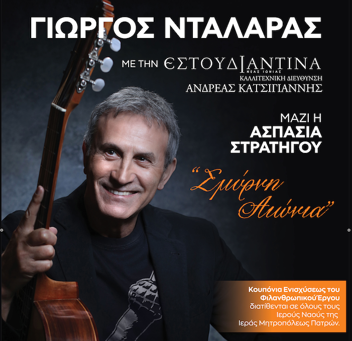 Η Περιφέρεια Δυτικής Ελλάδας σε συνεργασία με την Ιερά Μητρόπολη Πατρών, με στόχο την ενίσχυση του φιλανθρωπικού έργου της Μητροπόλεως πραγματοποιούν συναυλία με τον Γιώργο Νταλάρα και τίτλο «Σμύρνη Αιώνια», την Δευτέρα 19 Σεπτεμβρίου 2022 και ώρα 20.00 στο Παμπελοποννησιακό Στάδιο της Πάτρας, που παραχώρησε ο Δήμος Πατρέων.