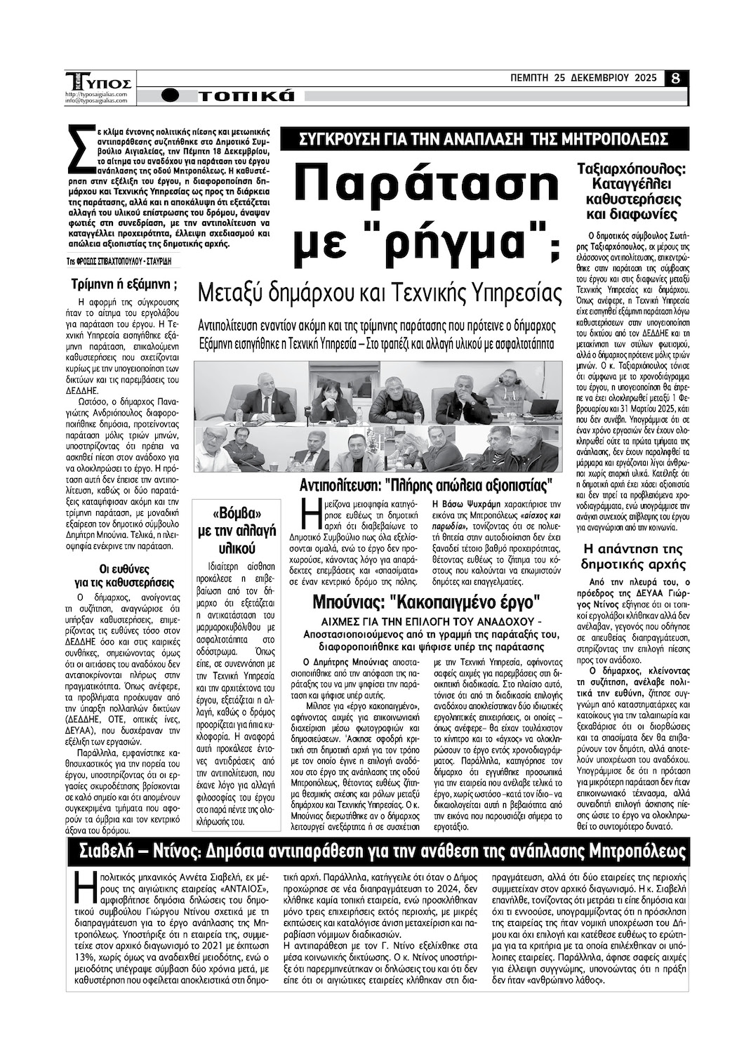 Σε κλίµα έντονης πολιτικής πίεσης και µετωπικής αντιπαράθεσης συζητήθηκε στο ∆ηµοτικό Συµβούλιο Αιγιαλείας, την Πέµπτη 18 ∆εκεµβρίου, το αίτηµα του αναδόχου για παράταση του έργου ανάπλασης της οδού Μητροπόλεως. Η καθυστέρηση στην εξέλιξη του έργου, η διαφοροποίηση δηµάρχου και Τεχνικής Υπηρεσίας ως προς τη διάρκεια της παράτασης, αλλά και η αποκάλυψη ότι εξετάζεται αλλαγή του υλικού επίστρωσης του δρόµου, άναψαν φωτιές στη συνεδρίαση, µε την αντιπολίτευση να καταγγέλλει προχειρότητα, έλλειψη σχεδιασµού και απώλεια αξιοπιστίας της δηµοτικής αρχής.