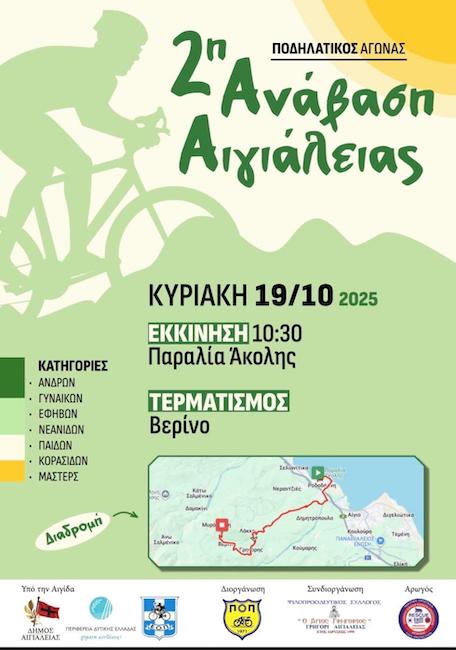Ο Δήμος Αιγιαλείας, σε συνεργασία με τον Ποδηλατικό Όμιλο Πατρών και υπό την αιγίδα της Ελληνικής Ομοσπονδίας Ποδηλασίας, διοργανώνει την 2η Ποδηλατική Ανάβαση Αιγιαλείας την Κυριακή 19 Οκτωβρίου 2025, στη Δημοτική Ενότητα Συμπολιτείας.