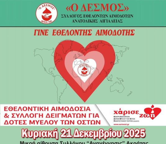 18η εθελοντική αιμοδοσία του ΕΚΑΜΕ Αιγίου την Κυριακή 14 Δεκεμβρίου