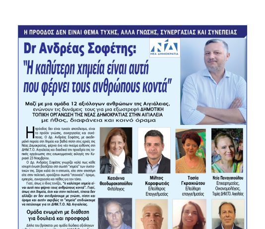 Dr Aνδρέας Σοφέτης: “Η καλύτερη χημεία είναι αυτή που φέρνει τους ανθρώπους κοντά” – Υποψήφιος Πρόεδρος της ΔΗΜ.Τ.Ο. Ν.Δ. Αιγιάλειας με 12 υποψήφιους συμβούλους